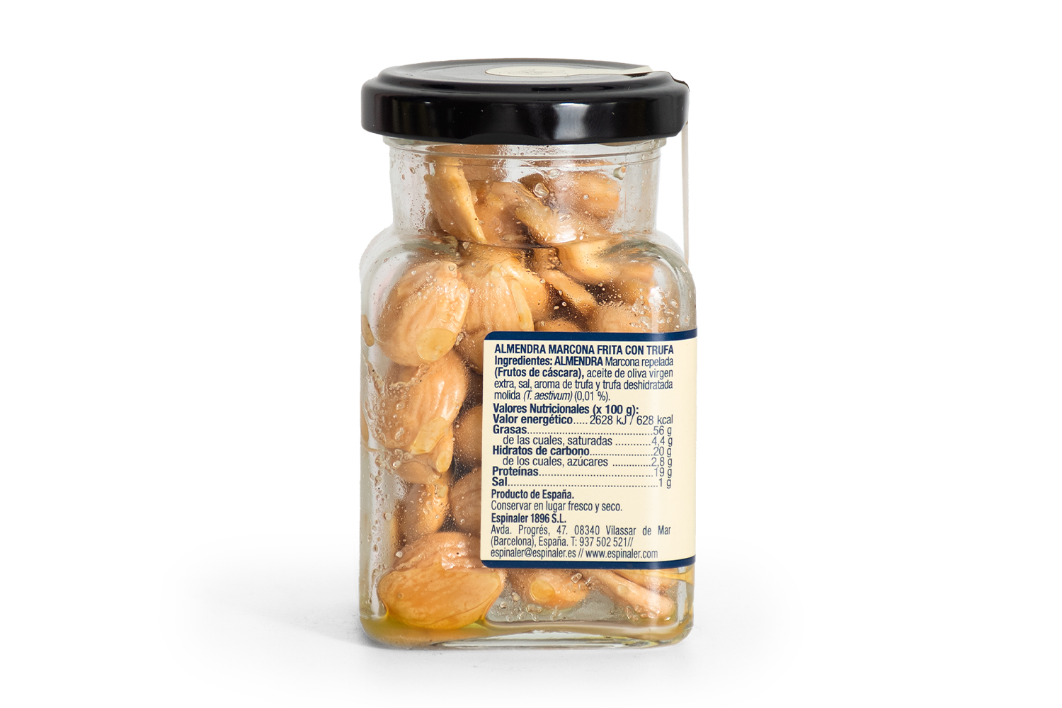 La almendra marcona con trufa negra Espinaler es un snack gourmet elaborado con almendra Premium de primera calidad, aceite de oliva Virgen Extra y trufa de verano deshidratada. Es ideal para acompañar a los aperitivos más sofisticados.