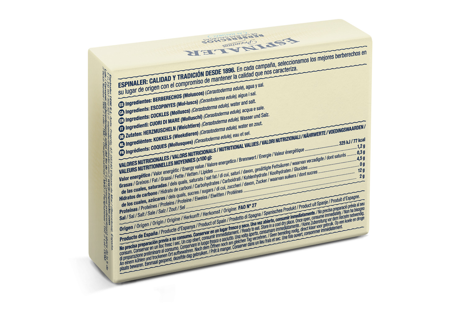 Los Berberechos Premium al Natural Espinaler son recogidos en las playas más reconocidas y valoradas de las Rías Gallegas. En Espinaler siempre hemos defendido la explotación racional y sostenible de las mejores playas y los fondos marinos, cosa que nos ha permitido, generación tras generación, mantener el delicado equilibrio marino y garantizar la calidad futura de los mejores Berberechos Premium Espinaler. Tras un delicado proceso de depuración en el que se seleccionan los mejores ejemplares, se empacan a mano para convertirse en una de las conservas de marisco más valoradas. Berberechos de tamaño mediano.