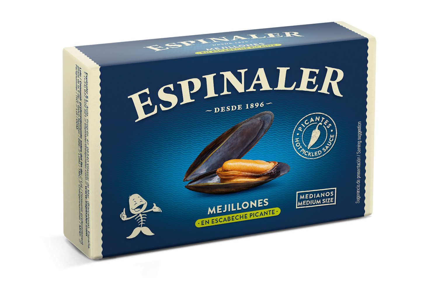 Los tradicionales mejillones Espinaler en escabeche picante atrapan a todo el que los prueba y es que el toque de guindilla en el escabeche natural Espinaler es ideal, una sorpresa para el paladar. La calidad de los mejillones Espinaler Classic recae en la pureza y limpieza de las aguas donde se recogen.
