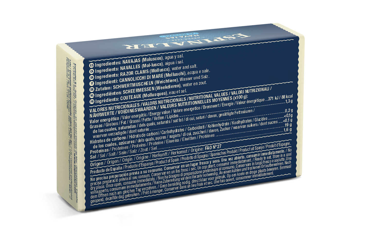 Las navajas Classic Espinaler se pescan y seleccionan en su momento óptimo para asegurar la máxima calidad. Proceden de arenas poco profundas y bañadas por amplias mareas. Los propios aceites naturales característicos de la navaja que aparecen en la lata son un regalo de la naturaleza y son garantía de calidad e intenso sabor, ¡no los desperdicies! Recomendamos beberlo directamente de la lata o como ingrediente insuperable de fondos para cocinar o en sofritos de pescado o marisco.
