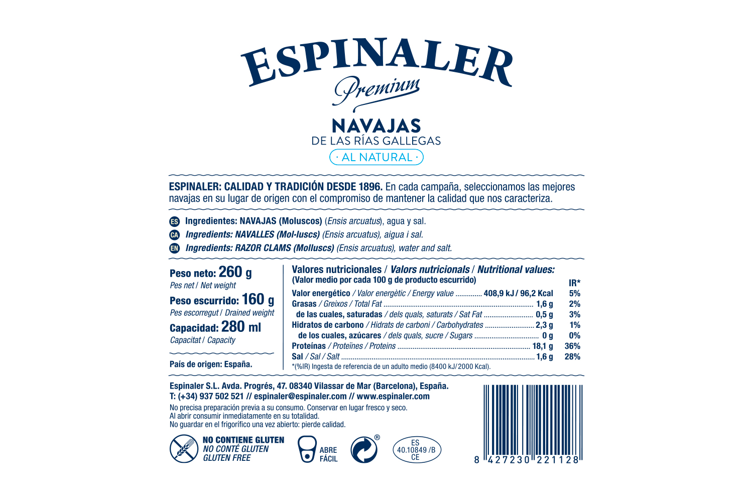 Las Navajas Premium al Natural son recogidas en las aguas de los alrededores de la Isla de Sálvora, en pleno paraíso natural en la desembocadura de la Ría de Arousa en Galicia. Debido a la extrema riqueza y al valor ecológico incalculable de las aguas que rodean este paraíso, la recogida sostenible de esta especie se realiza manualmente y respetando escrupulosamente el equilibrio biológico del ecosistema marino. Gracias a su incomparable origen, las navajas de Sálvora son mundialmente reconocidas como las mejores navajas por la fusión inigualable de su profundo y delicado sabor a mar, la ternura de su carne y los aceites naturales propios de la navaja, que aparecen de forma natural durante su conservación. Los mejores gourmets recomiendan probar este líquido directamente de la lata mientras se disfruta de la navaja o para usar en salsas o como fondo en sofritos de pescado y marisco.
