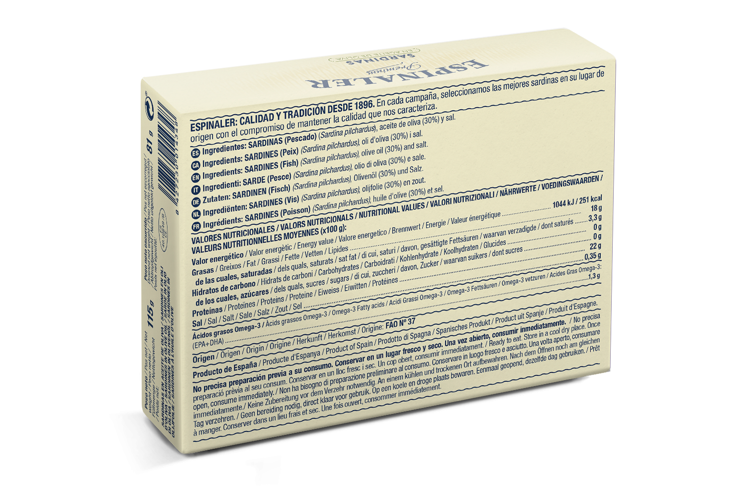 Las sardinas y sardinillas "Xeito" Espinaler Premium se pescan según el método tradicional y artesanal gallego, un sistema de pesca sostenible que garantiza la supervivencia de los bancos de peces así como la calidad de las sardinillas. Este sistema, el Xeito, consiste en un arte de pesca mediante enmalle de deriva con un paño rectangular extendido entre dos trallas, la superior, con boyas flotantes, y la inferior, con plomos de lastre. Nuestras sardinas y sardinillas "Xeito" se seleccionan cuidadosamente por su talla, se empacan a mano y se conservan en aceite de oliva.