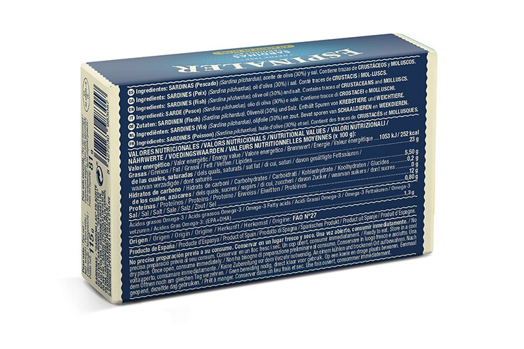 ¡La sardina más pequeña pero no menos sabrosa! Conservada en aceite de oliva para preservar su sabor natural. ¿Sabías que septiembre es el mejor mes para su pesca? Así se asegura la mejor calidad. Envasadas a mano y bañadas en aceite de oliva las sardinillas Espinaler son un auténtico manjar de piel brillante, carne jugosa y saborosa.